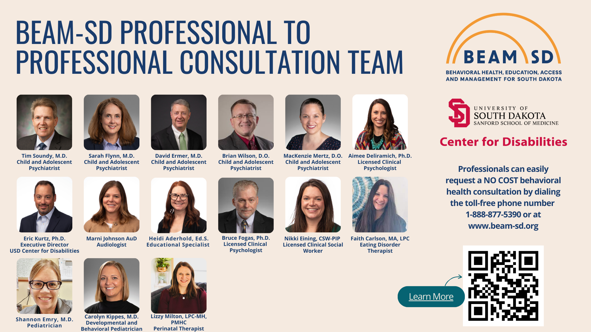 The BEAM-SD professional-to-professional consultation line provides support to healthcare, education, and behavioral health professionals who treat and work with children and adolescents (0-21) throughout South Dakota through teleconsultation with a multi-disciplinary team of pediatric behavioral health providers. This service is available during standard business hours and is offered at no cost to the professional or provider. Through this service, professionals can access direct consultation to address diagnostic questions, medication recommendations, appropriate psychotherapy referrals, behavioral health education, identification of local resources, and more.